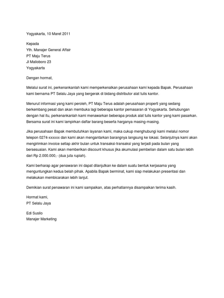 Contoh surat penawaran sangat banyak, mulai dari surat penawaran jasa, barang, dan kerjasama. Pada bagian ini berisi himbauan dan harapan kepada calon konsumen agar menjalin kerjasama dengan pemberi penawaran. Contoh surat penawaran barang dan jasa dan tips pembuatannya. Surat diatas merupakan contoh surat penawaran harga barang yang dikirimkan oleh pt maju komputer dengan maksud untuk menawarkan produk elektronik mereka. Dalam kesempatan ini, kami dari java cool courier bermaksud mengajukan penawaran kerja sama untuk pengiriman barang (baik berupa. Penjelasan lengkap seputar contoh surat penawaran yang baik dan benar. Surat ini dibuat sebagai perantara untuk menjalin kerja sama kata pembuka surat pada paragraf pertama berisikan uraian singkat mengenai alasan pengiriman surat surat penawaran berisi mengenai detail produk dan harga yang ditawarkan kepada calon. Kumpulan contoh surat penawaran mulai dari surat penawaran resmi, jasa, barang, kerjasama berserta dengan pengertian dan struktur surat penawaran. Pictures gallery of contoh surat penawaran jasa pengiriman barang. Bentuk kerjasama ini biasanya ialah untuk suatu kegiatan jual beli barang dan jasa, atau suatu penawaran kerja sama bisnis dan usaha. Kegiatan penawaran barang, jasa, atau kerjasama sudah sering dan mafhum dilakukan dalam dunia bisnis. Entah menawarkan barang, produk, jasa, kerjasama ataupun lainnya. Surat penawaran kerjasama sangat sering digunakan dalam lingkup perusahaan, baik perusahaan yang besar maupun kecil.